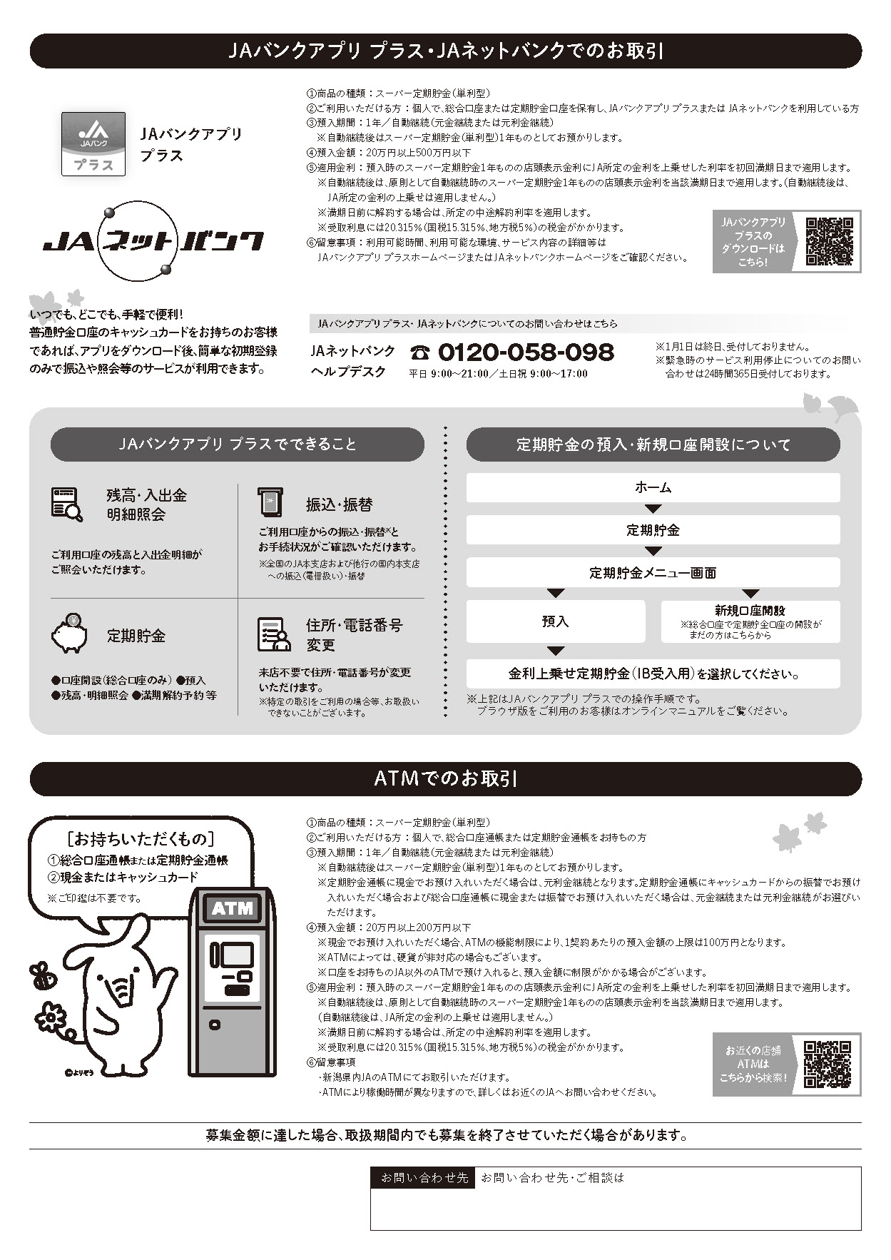 ※各JAにおいて募集金額に達した場合は、取扱期間内でも募集を終了させていただく場合があります。 また、新潟県信連では取り扱いがありません。 ※各JAにおける実施内容については、ご利用になるJAの窓口またはホームページでご確認ください。